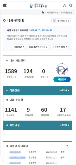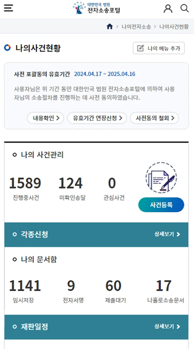 ✔ 모바일에서도 모든 기능 그대로 이용 가능하므로 장소에 관계없이 사건 조회 가능소송 중인 사건이 있다면 접수 상태, 기일 날짜, 판결 여부 등을 수시로 확인하는 것이 중요합니다. 지금 바로 나의사건검색을 통해 내 사건을 점검해 보세요.