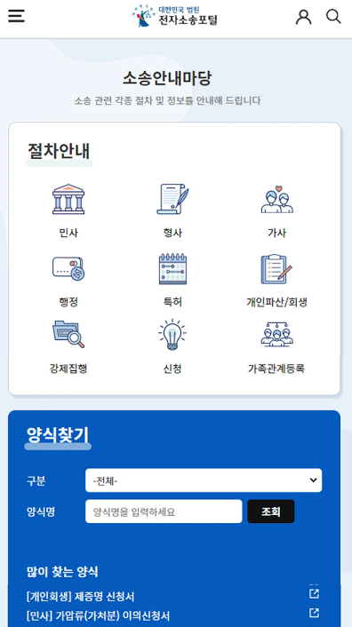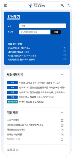 내손안의 또 다른 법원 전자소송포털 앱 전자소송포털은 기존 전자소송 홈페이지의 전자소송기능은 물론 별도의 대국민 민원서비스 홈페이지로 존재하던 전자민원센터의 각종 소송절차안내