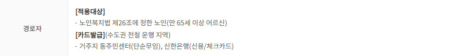 - 일반 경로우대 카드: 버스나 기차 요금 할인 적용