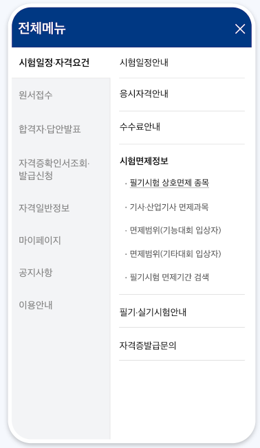 - 자격증 정보 검색: 시험 종목별 개요, 응시자격, 출제 기준 등 확인 가능