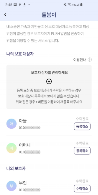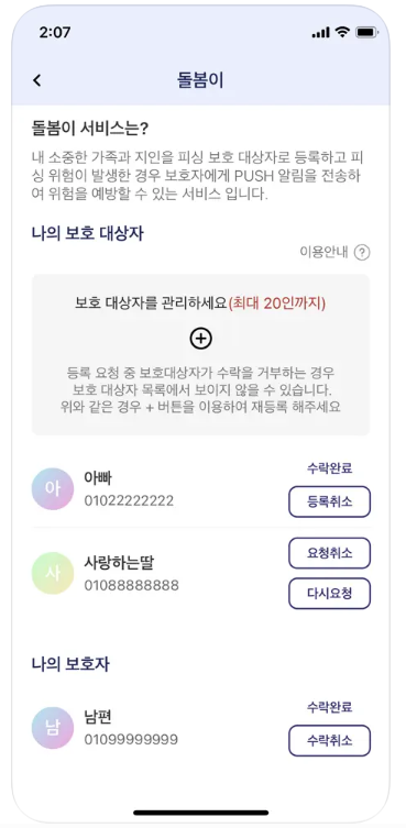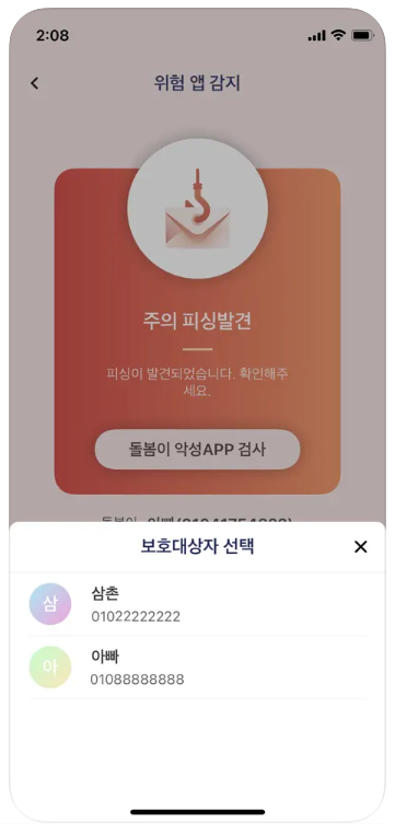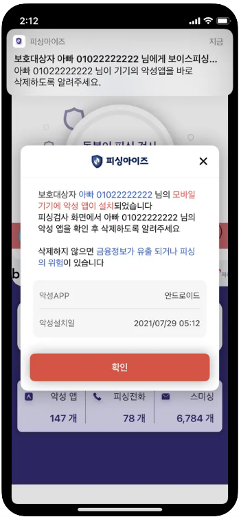 피싱아이즈는 제휴금융사와 다양한 유형의 피싱에 대해 공동으로 분석하고 대응함으로써, 이용자들에게 최적의 예방의 솔루션을 제공합니다. 피싱아이즈는 나의 가족 및 지인의 휴대폰에서