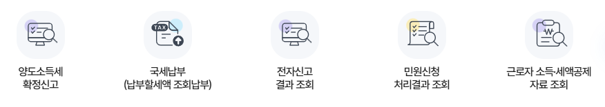매년 1월이 되면 직장인들의 필수 코스인 연말정산 간소화 서비스가 제공됩니다. 의료비, 교육비, 보험료 등 공제 자료를 자동으로 모아주고, 클릭 몇 번만으로 간편하게 자료를 제출할 수 있습니다.2. 종합소득세, 부가가치세 신고