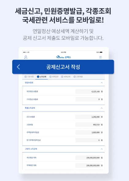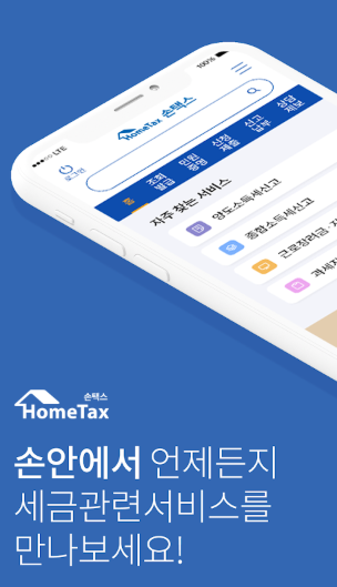 * 국세청 모바일 홈택스 [손택스] - 국세상담센터 (국번없이) 126 국세청 모바일 홈택스 [손택스] 앱에서는 회원가입, 세금신고 및 납부, 국세민원, 장려금 신청, 연말정산간소화 서비스, 현금영수