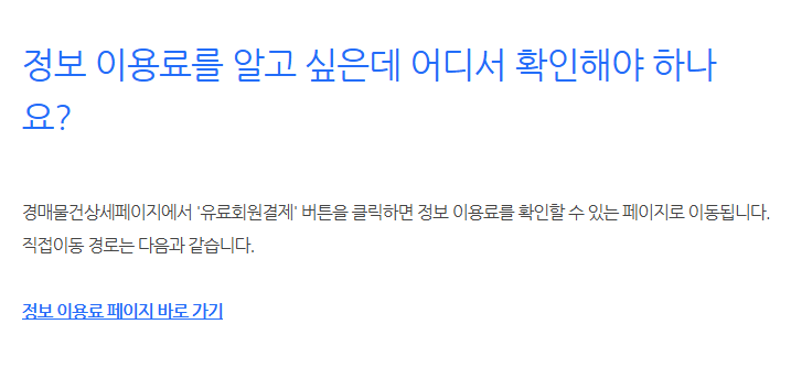- 정보 이용료는 유료회원결제 버튼을 클릭하면 확인할 수 있으며, 해당 경매물건의 상세페이지에서 바로 이동 가능합니다.