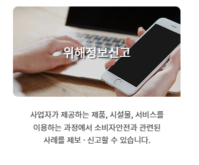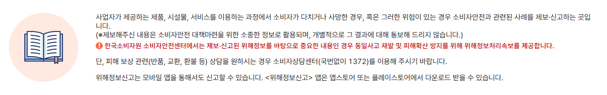 - 위해정보 신고 외에도 리콜조회, 피해구제 연계 등 다양한 기능을 이용할 수 있습니다.