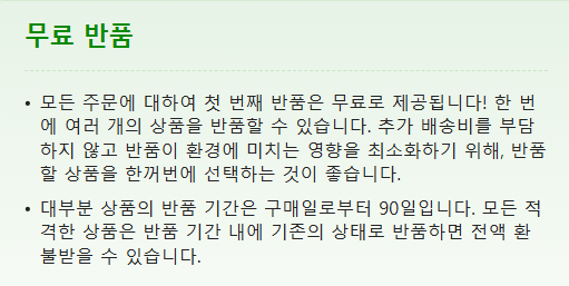 회원가입, 상품 검색, 결제, 고객센터까지 한국어 지원 - 무료 배송 기준이 낮고 반품도 간편함